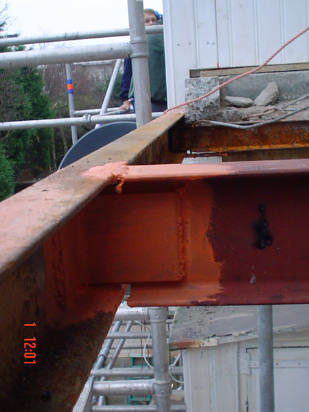 De balkonnetjes aan de achterzijde van de woningen zijn opgebouwd uit een stalen frame waartussen een betonnen vloer aangebracht is. Het staal was ernstig aan het roesten, waardoor er betonrot was ontstaan. We hebben de gevel ter plaatse van het stalen frame opengehakt, een kopplaat op de ligger in de gevel gelast en vervolgens een nieuw frame aangebracht. Tussen het frame is een nieuwe balkonvloer gestort.